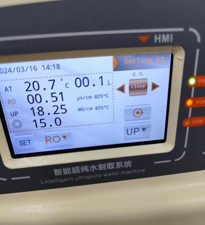 3、水质时间间隙自动循环、防止超纯水受二次污染,确保超纯水稳定在18.25MΩ.cm