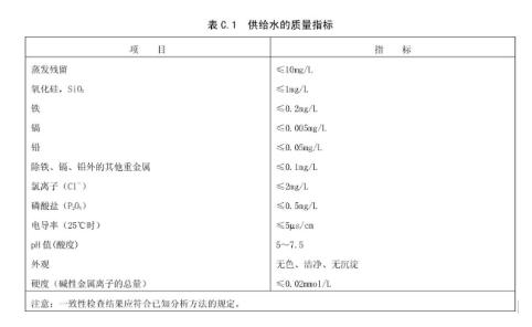 除了硬度要求,灭菌器的进水还对其他指标有较高的要求,比如水中铁,pH值、镉、铅等重金属杂质。国标《GB 8599-2008大型蒸汽灭菌器技术要求自动控制型》对灭菌器的进水指标做出了规定。要求进水电导率不超过5 μS/cm,二氧化硅含量不超过1㎎/L,硬度要求不超过0.02 mol/L,还对铁、镉、铅、氯离子、磷酸盐、pH、重金属离子等做出了详细的规定(如下图所示)。