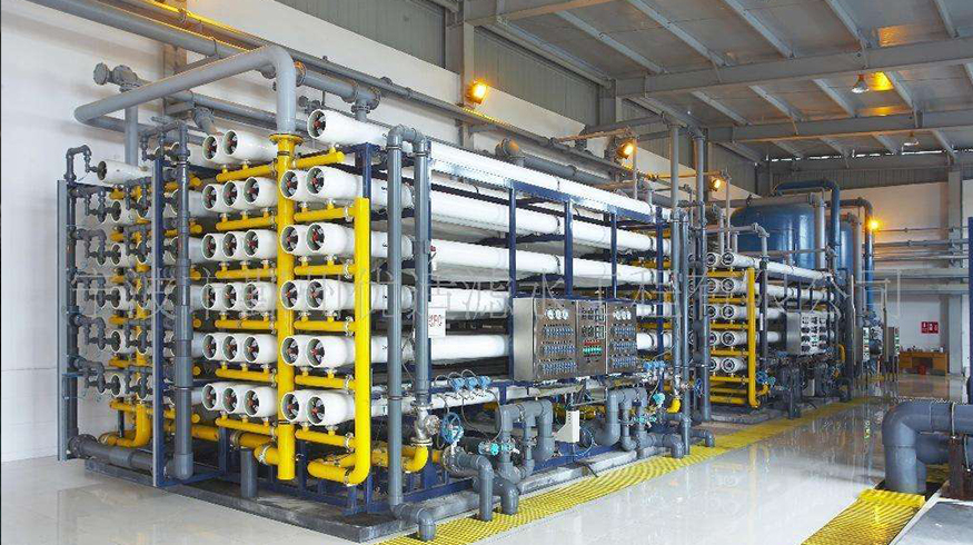 自来水→多介质过滤器→活性炭过滤器→软化水器→中间水箱→低压泵→精密过滤器→一级反渗透→PH调节→混合器→二级反渗透(反渗透膜表面带正电荷)→纯水箱→纯水泵→中间水箱→EDI水泵→EDI系统→微孔过滤器→用水点