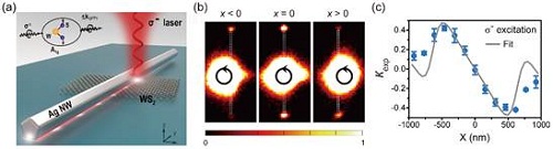 图 (a) 手性拉曼的定向耦合的结构体系:多层二硫化钨上的银纳米线;(b)二硫化钨的拉曼成像;(c)不同激光光斑-银线距离下的拉曼光的定向性