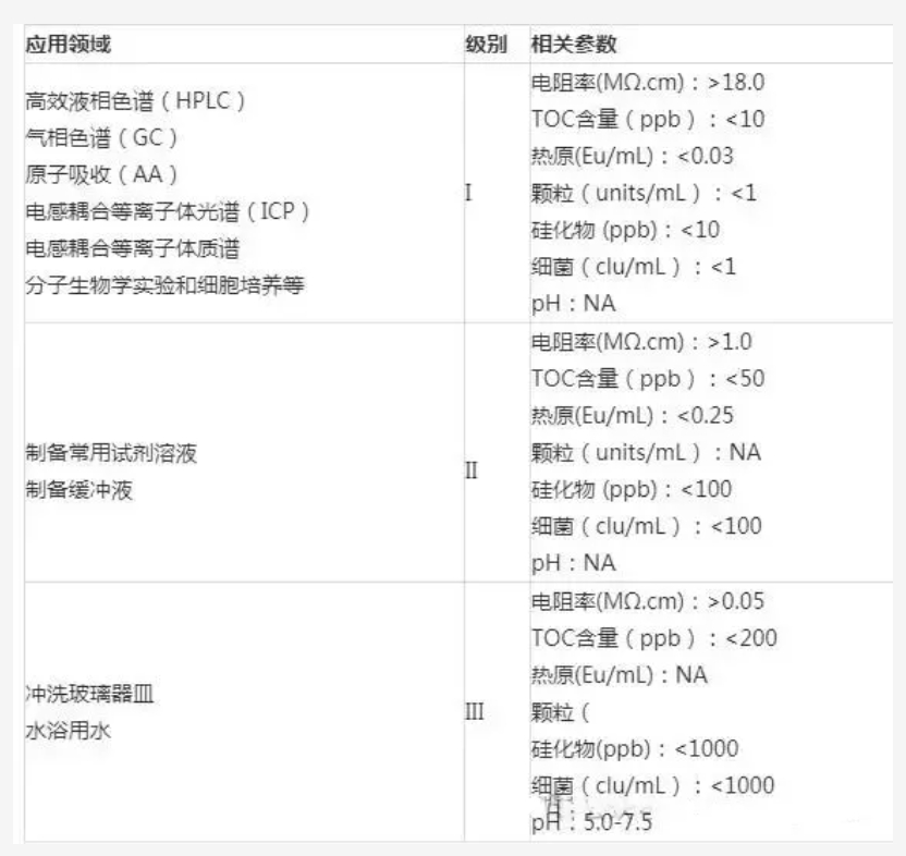 目前,实验室用水分为蒸馏水、去离子水、实验室高纯水和实验室超纯水等。通常情况下,实验室常用水与实验室用水标准的对应关系为:
