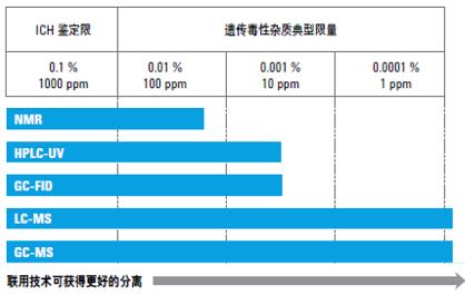 随着分析技术的不断进步和分析方法的不断优化,对于基因毒性杂质检测的灵敏度要求越来越高。以前,分析基因毒性杂质,将 HPLC (配有 UV/Vis 检测器)及 GC(配有 FID 检测器)作为常规分析方法。近年来,LC-MS和GC-MS等分析方法正在被越来越多的使用,检测限一般在ppb级,以获得更高的灵敏度和特异性。