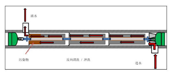反渗透膜的正向清洗,是清洗液从压力容器进水端流入,经过膜元件后从压力容器浓水端流出,该流向与 RO 系统正常运行时一致,是常见且有效的清洗方式。