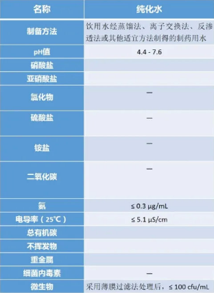 纯化水应当符合2020版《中华人民共和国药典》所收载的纯化水标准,在2020版《中华人民共和国药典》中明确指出,医药用纯化水ph值为4.4-7.6、硝酸盐≤0.06μg/mL、亚硝酸盐≤0.02μg/mL、氨≤0.3μg/mL、电导率(25℃)≤5.1μS/cm、总有机碳≤0.50mg/L(≤500ppb)、不挥发物≤10mg/L、重金属≤0.1μg/mL、微生物采用薄膜过滤法处理后≤100cfu/mL。