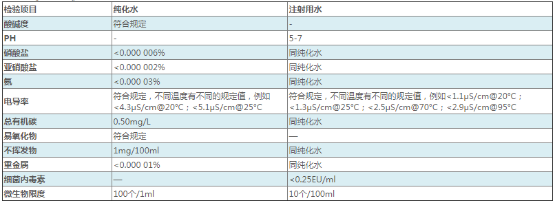 中国药典纯化水以及注射用水标准及检验项目