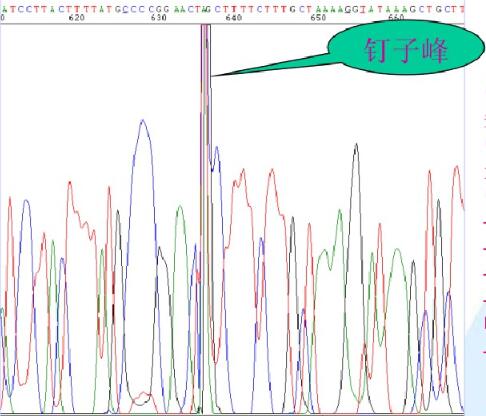 “钉子峰”是A、T、C、G四个颜色的峰都被突然拔起,形成的尖锐峰形。